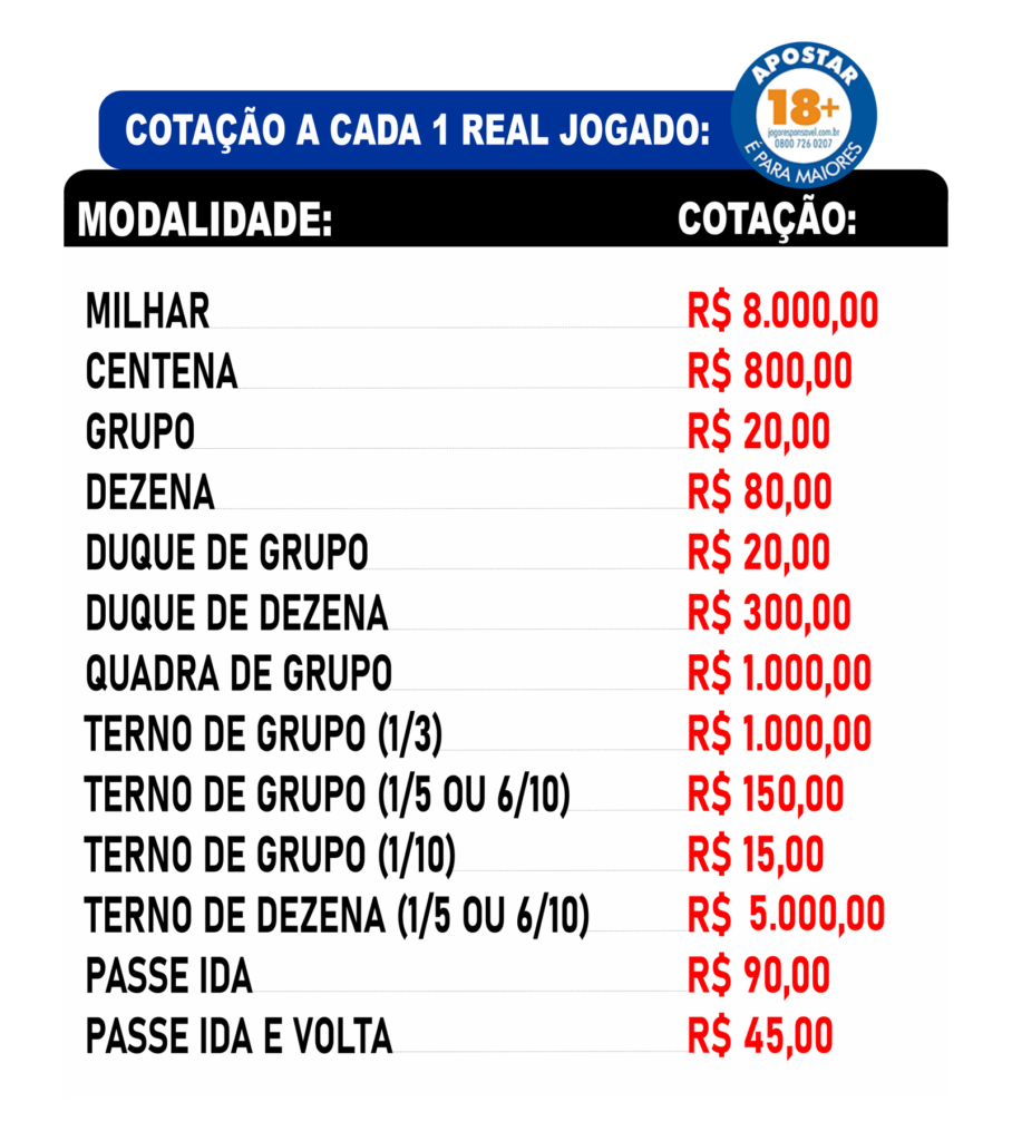 Acertando a Quadra de Grupo 1º ao 5º com 4 grupos, paga-se a cotação indicada de 800 a 1.000 x1.